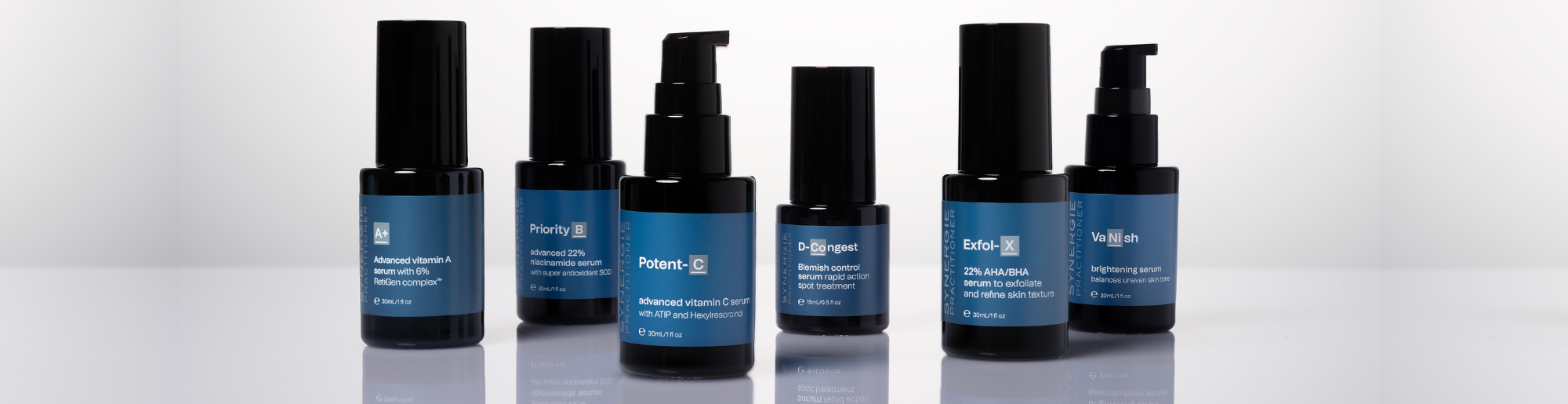Zes geavanceerde cosmeceuticals, ontwikkeld op basis van de Synergie Skin-formules.
