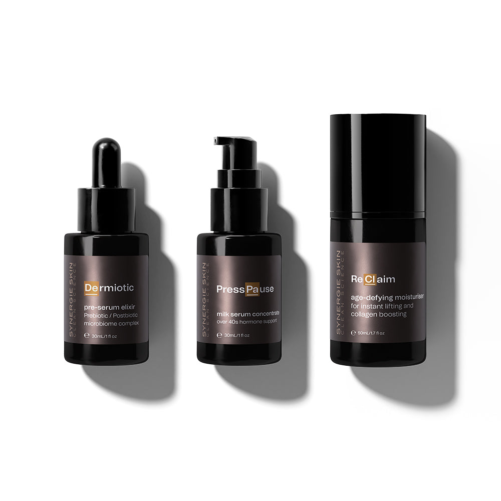 Vier elke fase van de reis van je huid met dit krachtige trio: een pre-serum elixir, serum en anti-aging moisturizer. Ontwikkeld om de huid te ondersteunen tijdens hormonale veranderingen, biedt Glowden Years herstel van de barrière, diepe hydratatie en collageenvernieuwing in een drie-stappenroutine met Dermiotic (30mL), PressPause (30mL) en ReClaim (50mL).