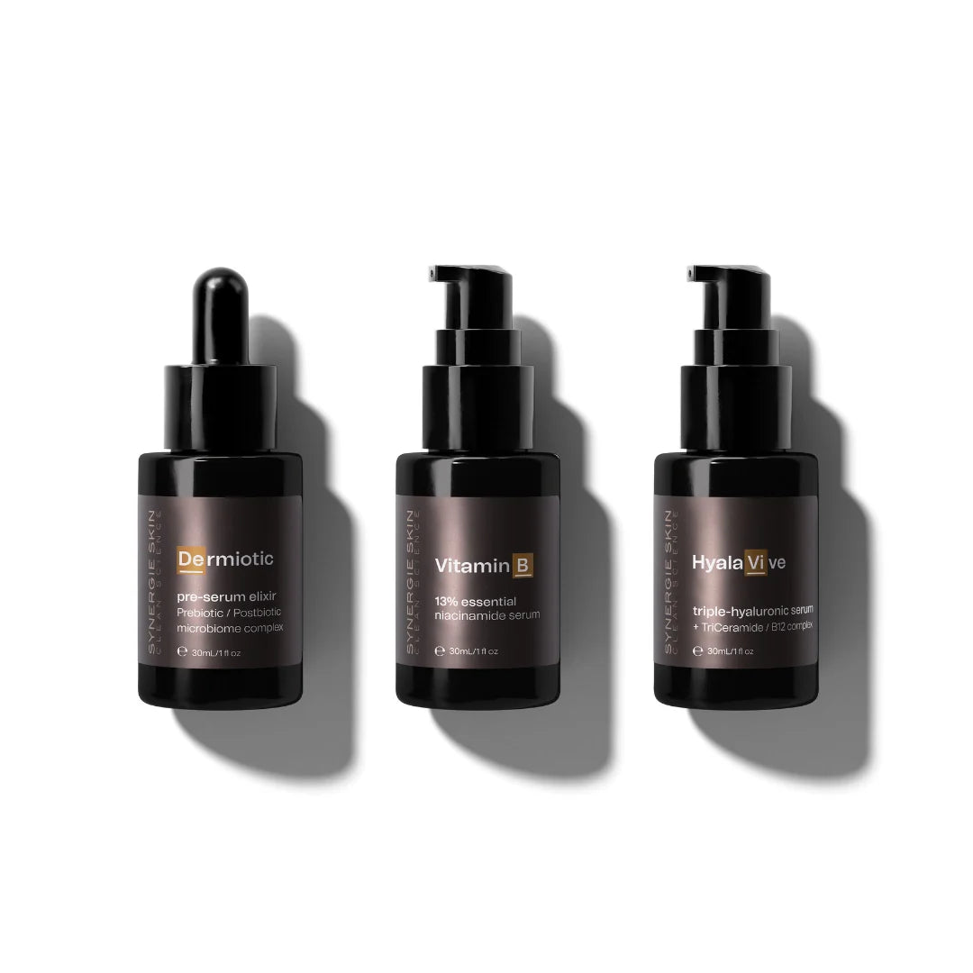 Dit zorgvuldig samengestelde trio bevat onze iconische microbioombalancer (Dermiotic 30ml) en essentiële serums (HyalaVive 30ml en Vitamin B 30ml).