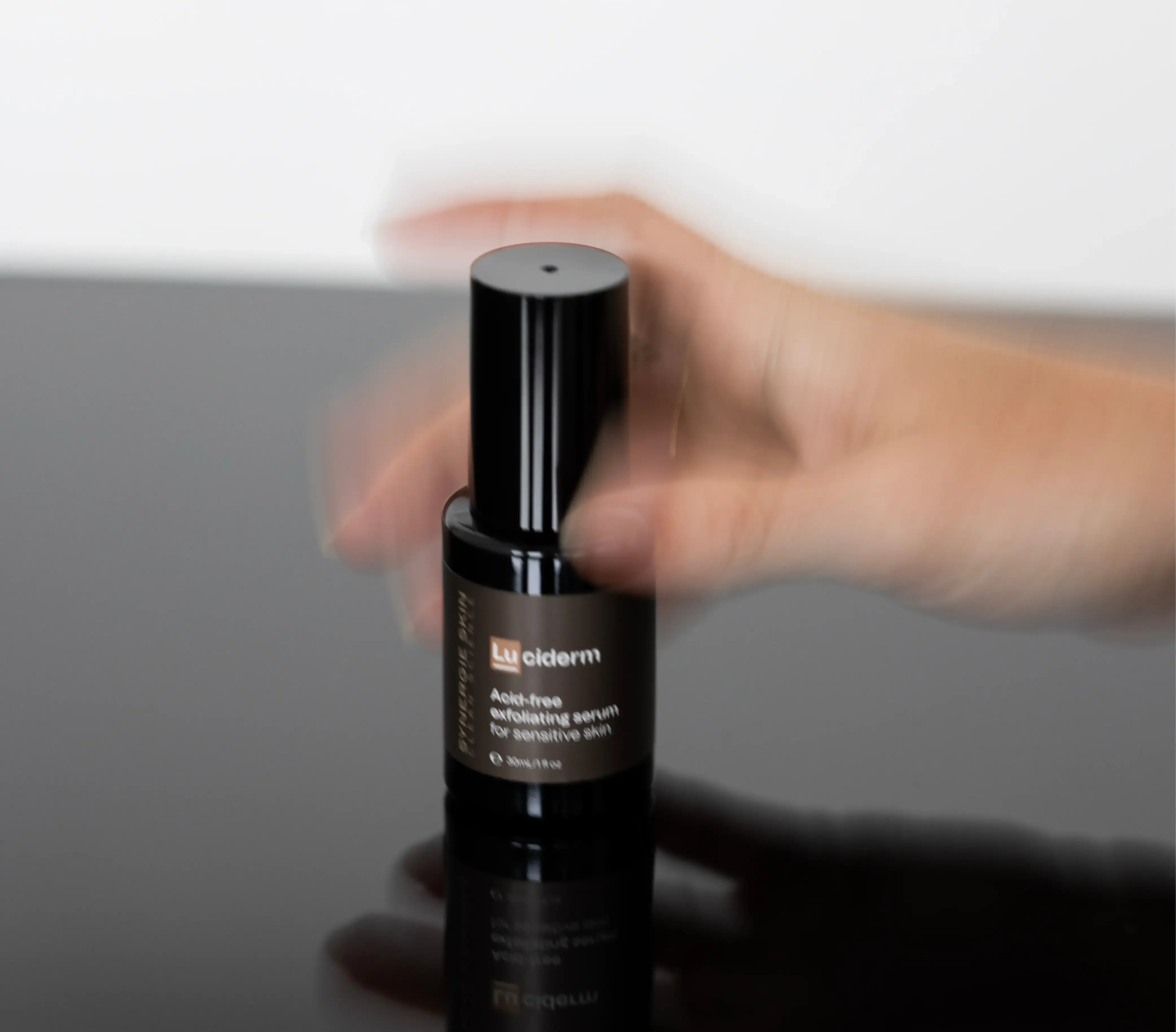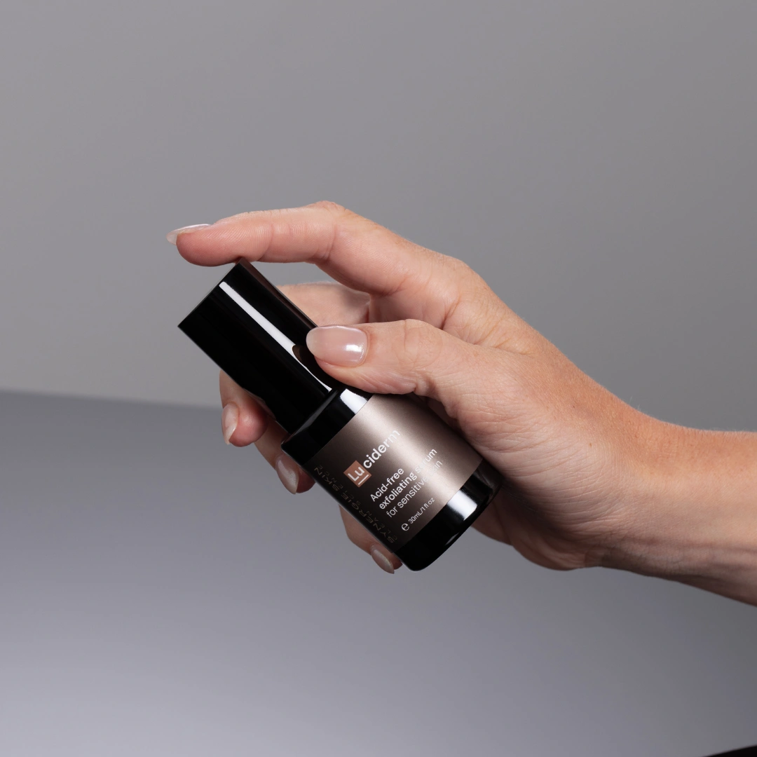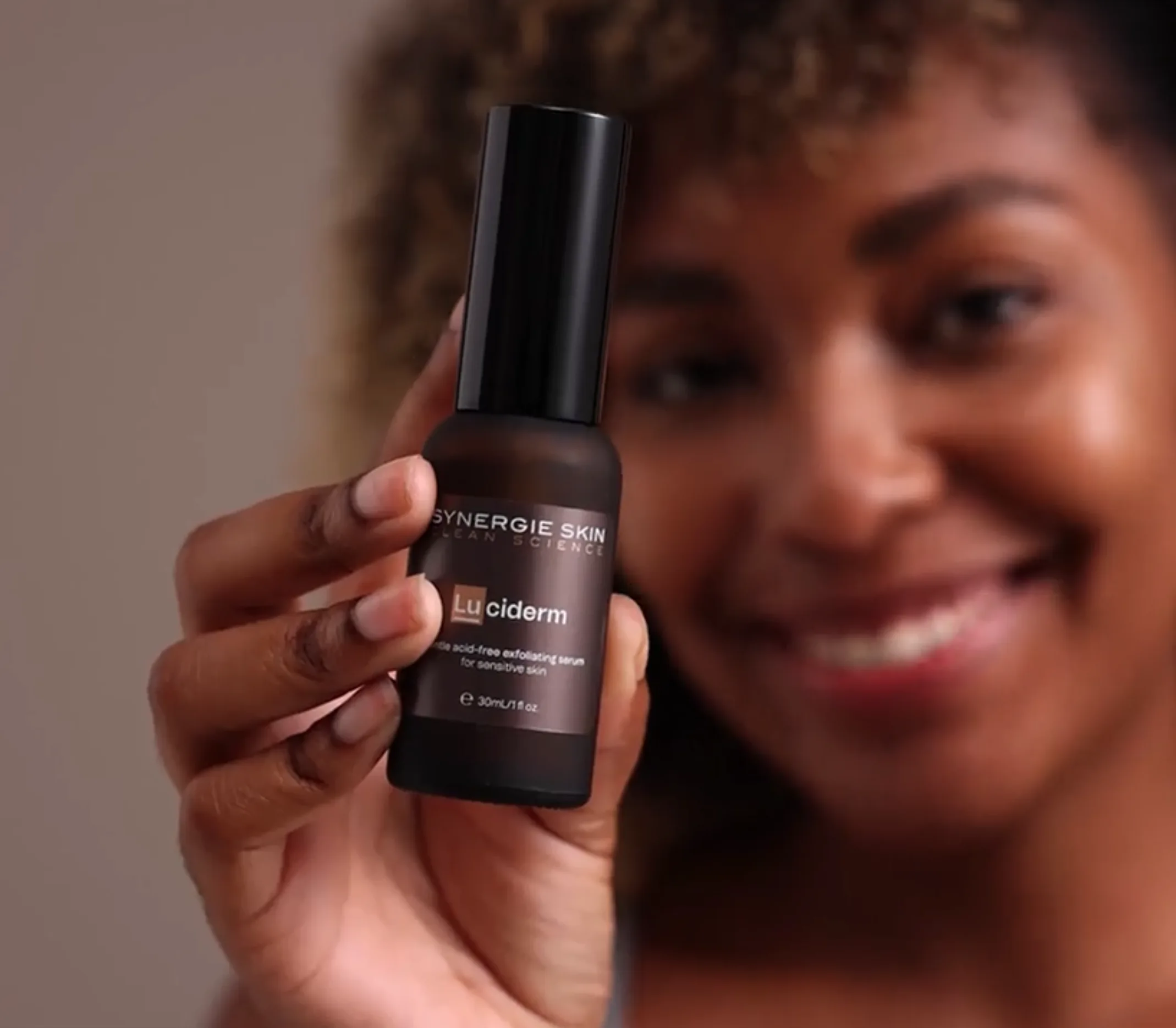 Luciderm is een unieke, zuurvrije chemische exfoliant voor de gevoelige huid. In plaats van zuren toe te voegen die sommige mensen niet kunnen verdragen, formuleerde ik Luciderm als een zachte dagelijkse exfoliant met bio-actieve gistpeptiden en soja-aminozuren die doffe huidcellen verwijderen, celvernieuwing stimuleren en huidcongestie en ongelijkmatige teint verminderen. Het is klinisch aangetoond dat het effectiever is bij exfoliëren dan 8% glycolzuur. Dit is een ideale optie voor diegenen die last hebben van gevoeligheid maar toch moeten scrubben.