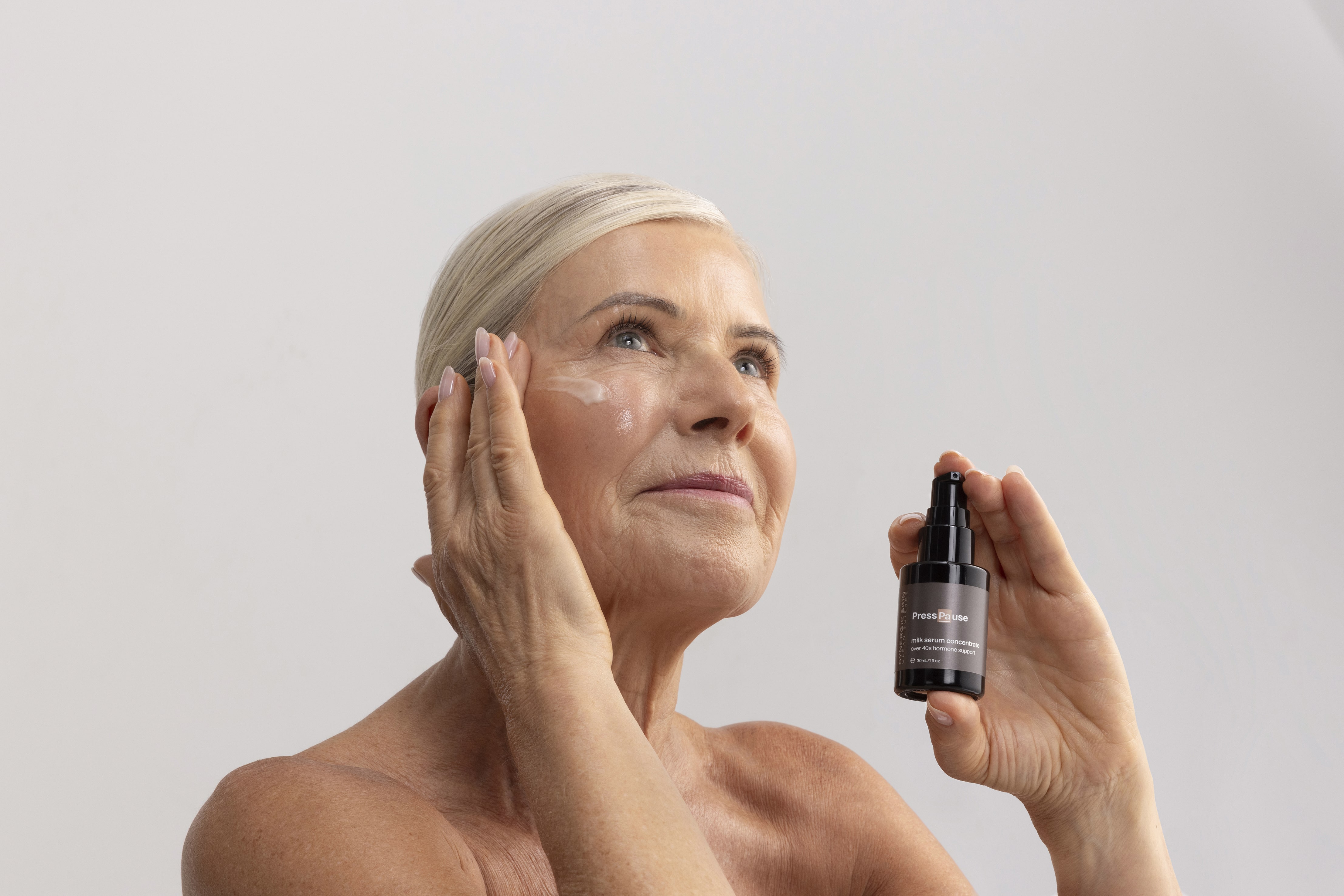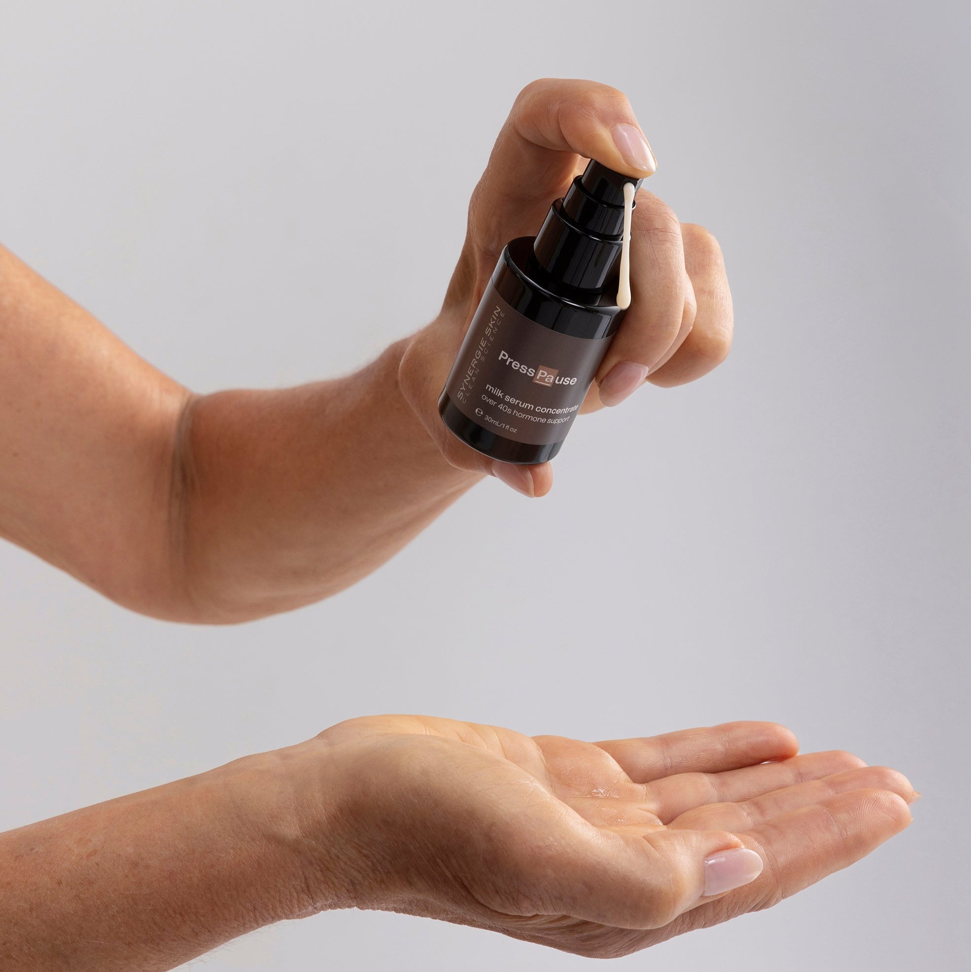 Deze formule maakt gebruik van de kracht van soja-isoflavonen, roze microalg-extract en carnosine dipeptide om huidveroudering door glycatie, schade door vrije radicalen, droogheid en ontstekingen tegen te gaan. Het PressPause melkserum helpt de huid sterker, gehydrateerd en stralend te houden. Dit is mijn manier om gerichte huidverzorging te bieden voor deze belangrijke levensfase, zodat we deze periode kunnen omarmen in plaats van vrezen."